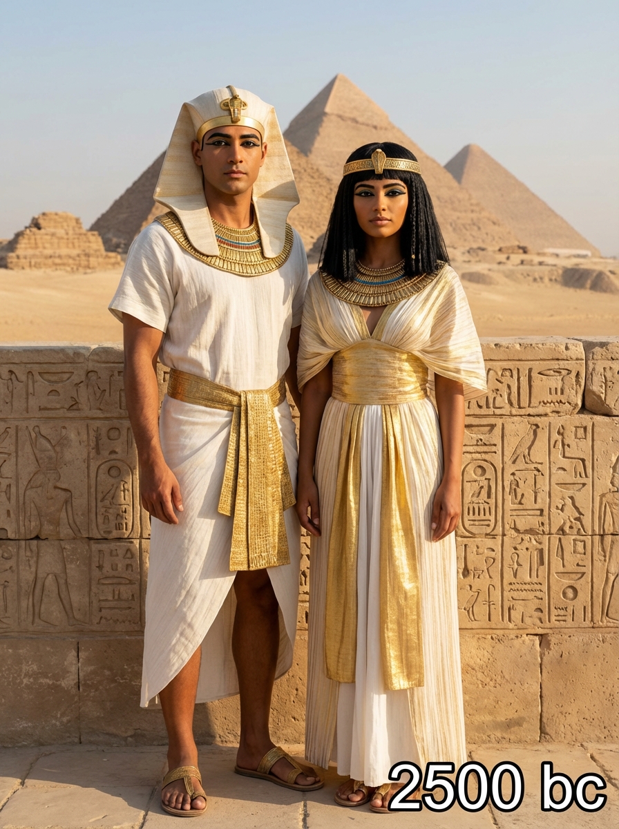 Ancient Egyptian couple from 2500 BC in pharaonic era clothing - linen dress with gold collar necklace, kohl-lined eyes, elaborate headdress , posed together near pyramids with hieroglyphic wall art, text overlay in bottom corner reading "2500 BC" in white sans serif font with black outline