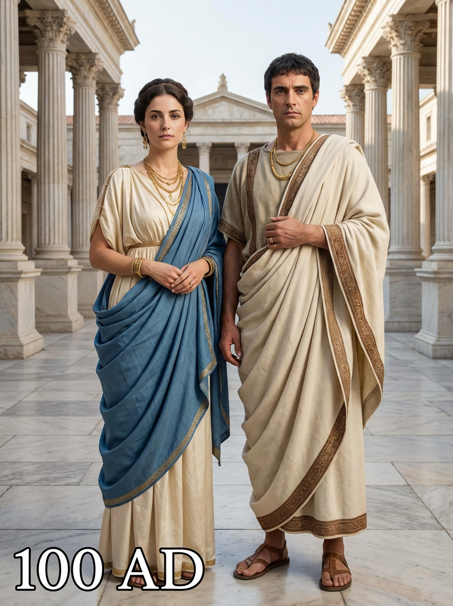 Ancient Roman couple from 100 AD in classical Roman clothing - elegant stola with palla draped over shoulders, gold jewelry , standing together in a marble columned forum with classical architecture, text overlay in bottom corner reading "100 AD" in white sans serif font with black outline