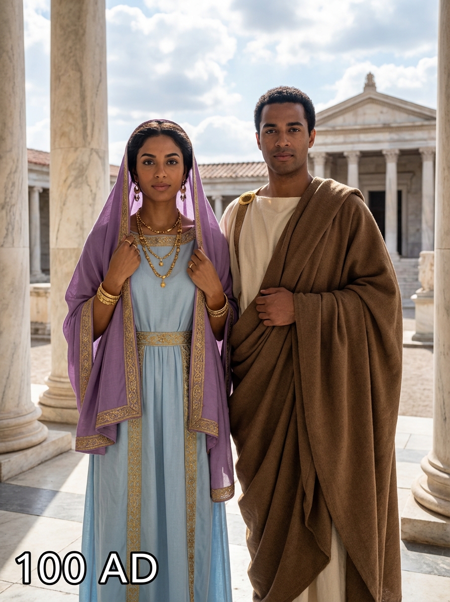 Ancient Roman couple from 100 AD in classical Roman clothing - elegant stola with palla draped over shoulders, gold jewelry , standing together in a marble columned forum with classical architecture, text overlay in bottom corner reading "100 AD" in white sans serif font with black outline