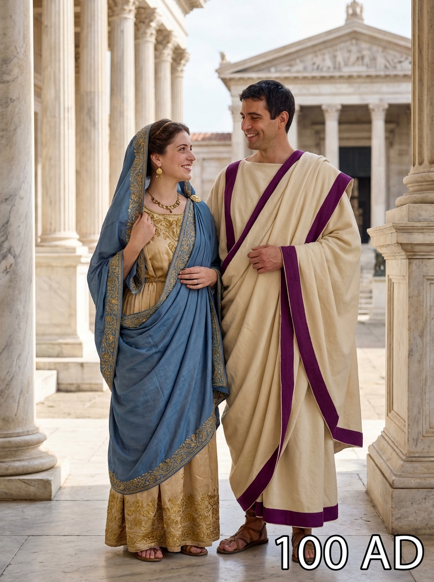 Ancient Roman couple from 100 AD in classical Roman clothing - elegant stola with palla draped over shoulders, gold jewelry , standing together in a marble columned forum with classical architecture, text overlay in bottom corner reading "100 AD" in white sans serif font with black outline