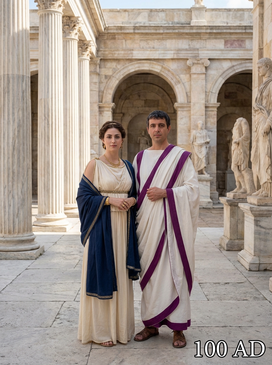 Ancient Roman couple from 100 AD in classical Roman clothing - elegant stola with palla draped over shoulders, gold jewelry , standing together in a marble columned forum with classical architecture, text overlay in bottom corner reading "100 AD" in white sans serif font with black outline