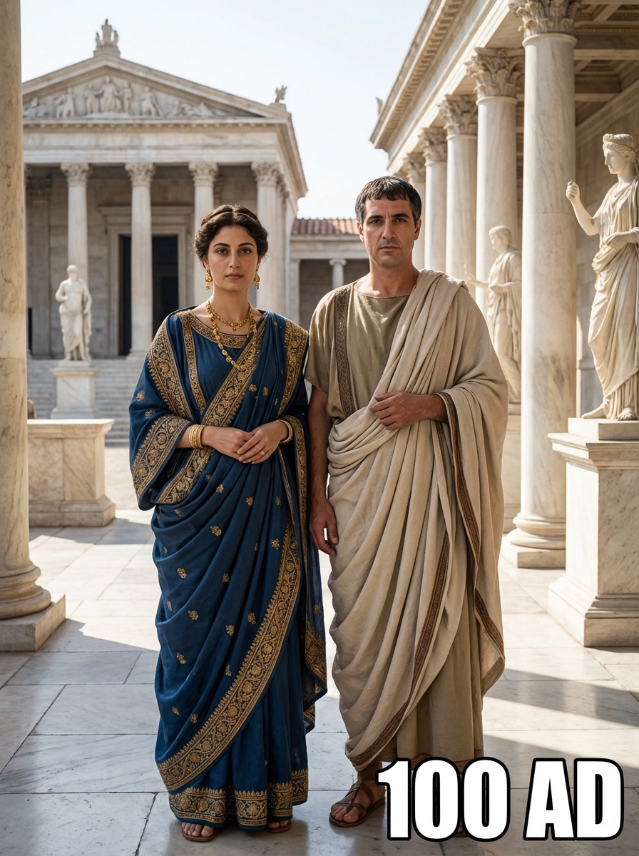 Ancient Roman couple from 100 AD in classical Roman clothing - elegant stola with palla draped over shoulders, gold jewelry , standing together in a marble columned forum with classical architecture, text overlay in bottom corner reading "100 AD" in white sans serif font with black outline