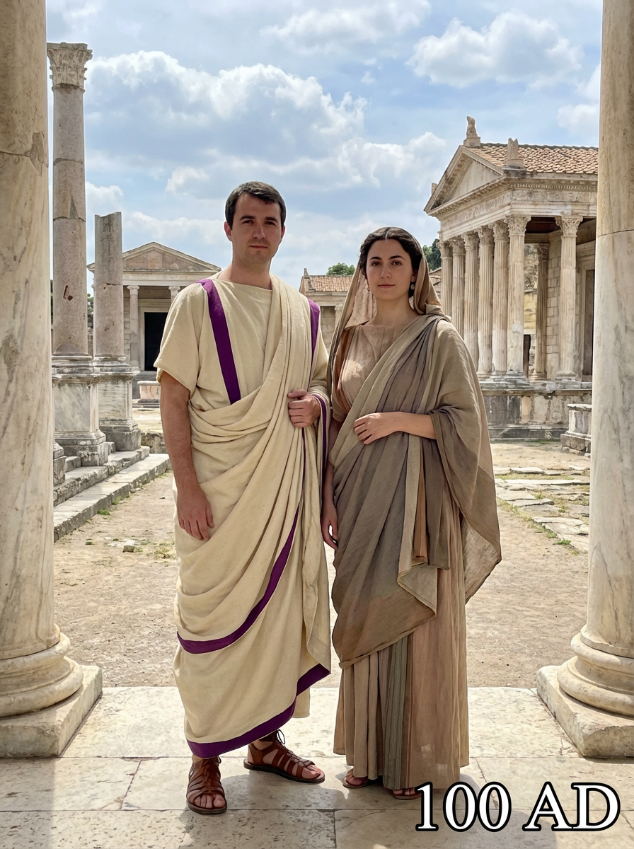 Ancient Roman couple from 100 AD in classical Roman clothing - toga or tunic with sandals, standing together in a marble columned forum with classical architecture, text overlay in bottom corner reading "100 AD" in white sans serif font with black outline