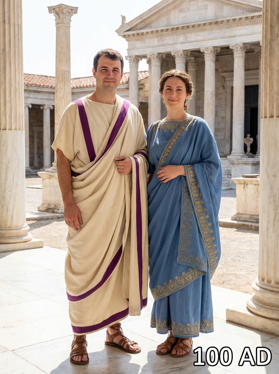 Ancient Roman couple from 100 AD in classical Roman clothing - toga or tunic with sandals, standing together in a marble columned forum with classical architecture, text overlay in bottom corner reading "100 AD" in white sans serif font with black outline