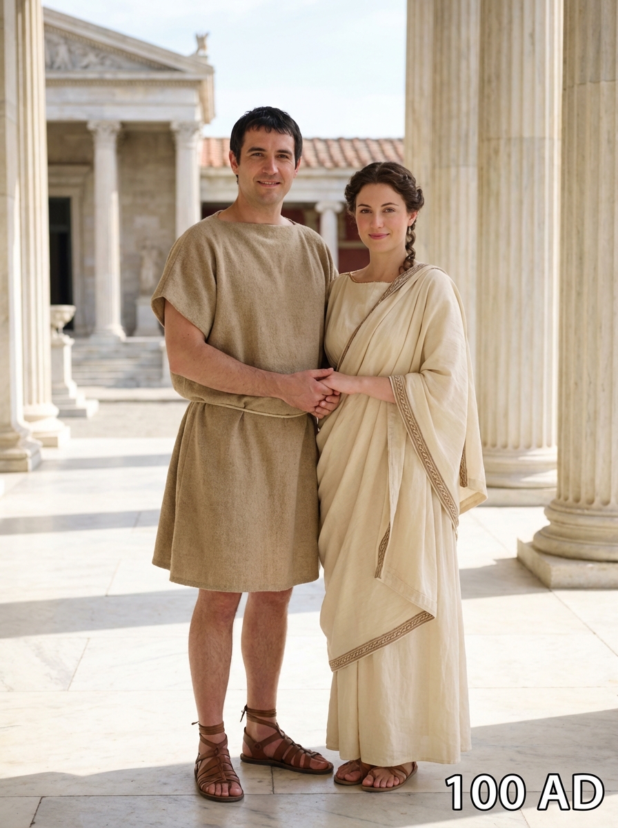 Ancient Roman couple from 100 AD in classical Roman clothing - toga or tunic with sandals, standing together in a marble columned forum with classical architecture, text overlay in bottom corner reading "100 AD" in white sans serif font with black outline