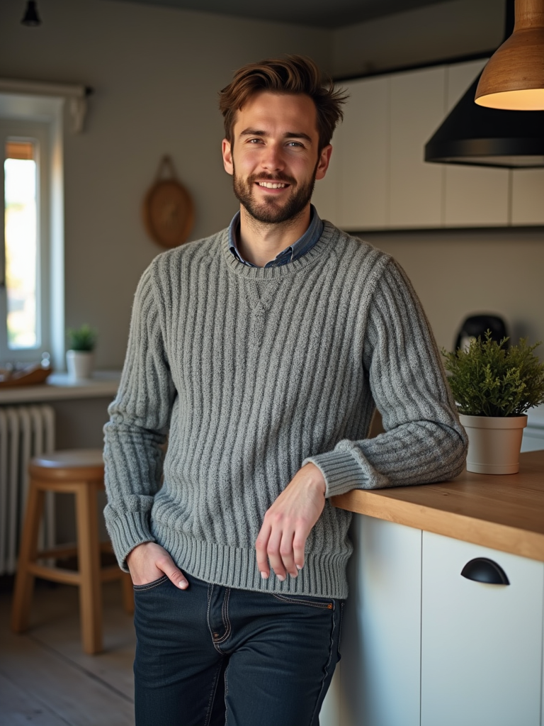 approachable model in quality knit sweater with dark jeans leaning against desk, modern office kitchen