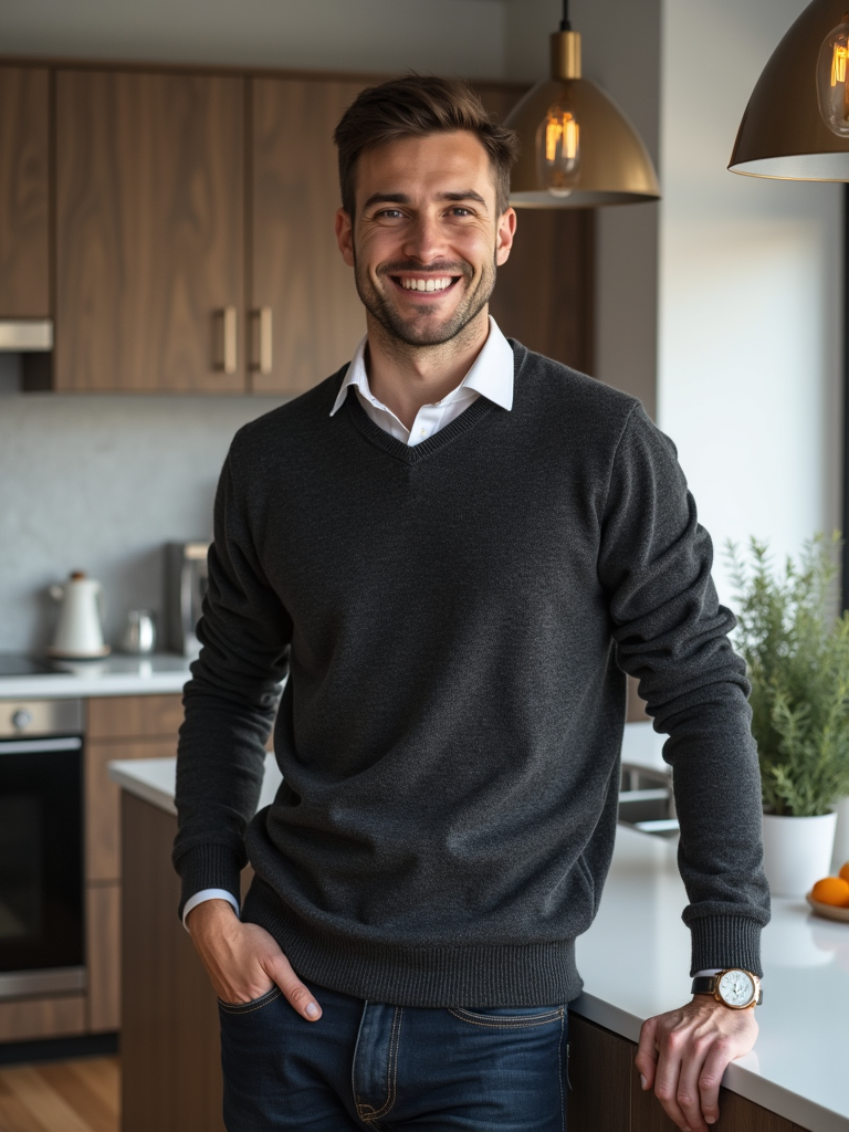 approachable model in quality knit sweater with dark jeans leaning against desk, modern office kitchen