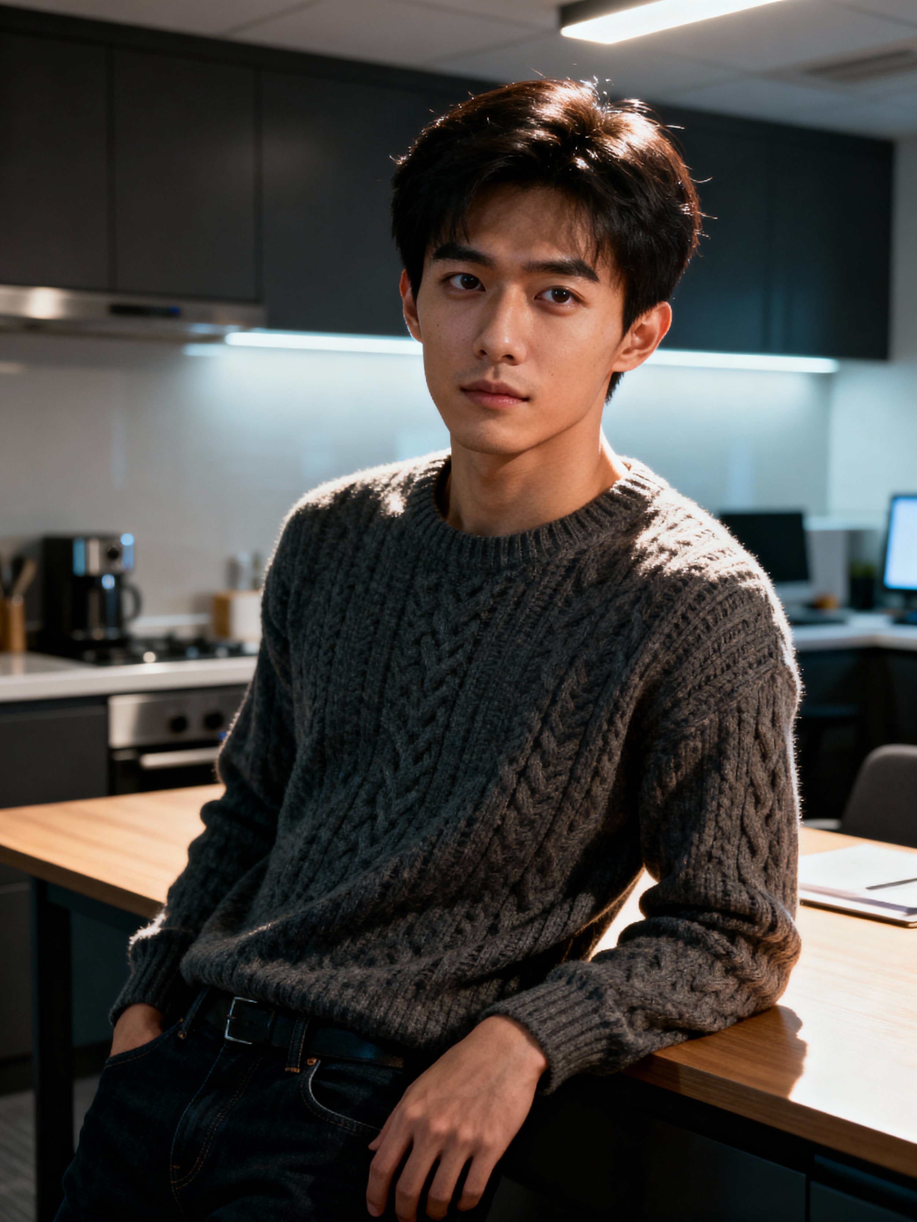 approachable model in quality knit sweater with dark jeans leaning against desk, modern office kitchen