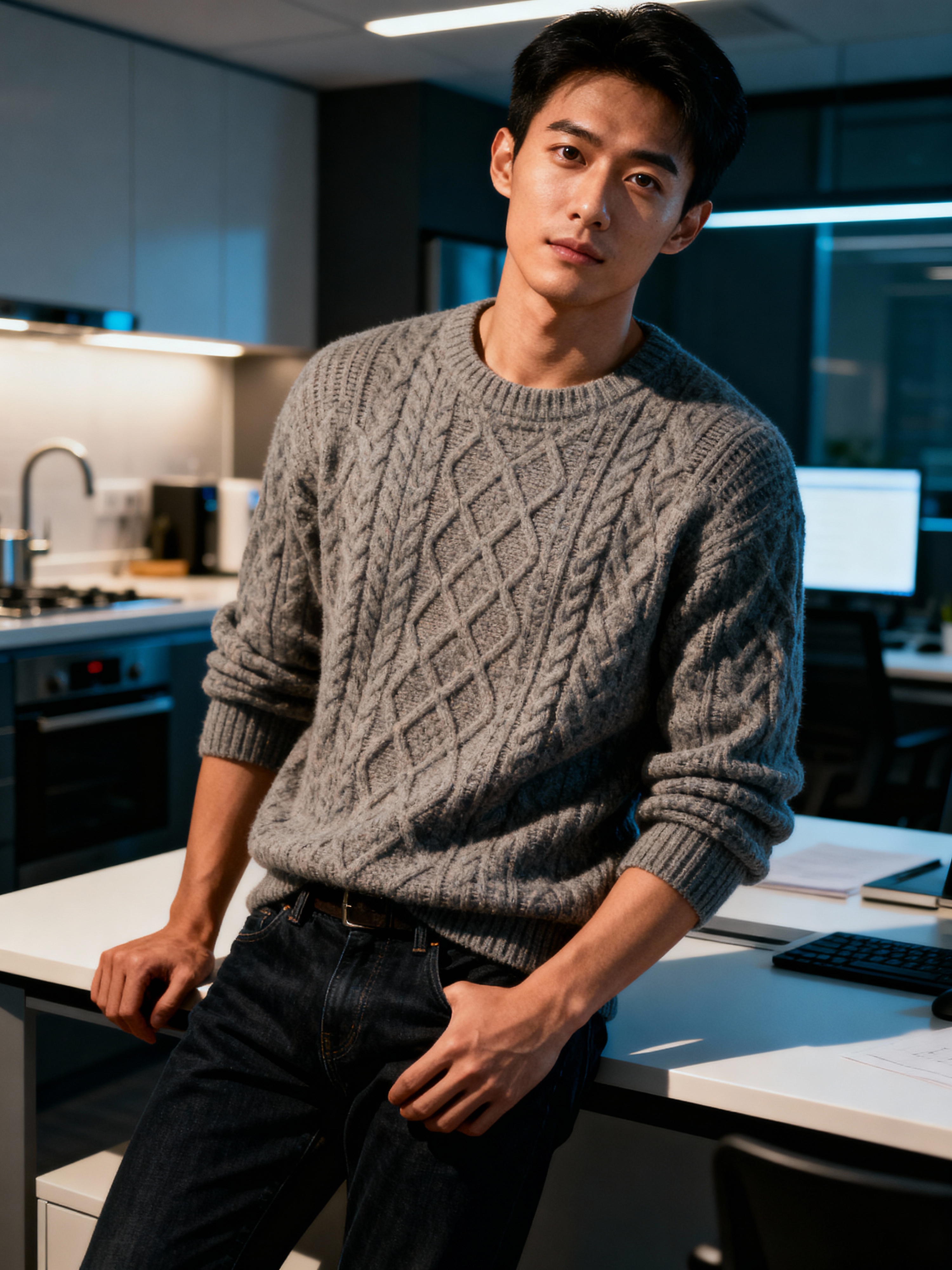 approachable model in quality knit sweater with dark jeans leaning against desk, modern office kitchen