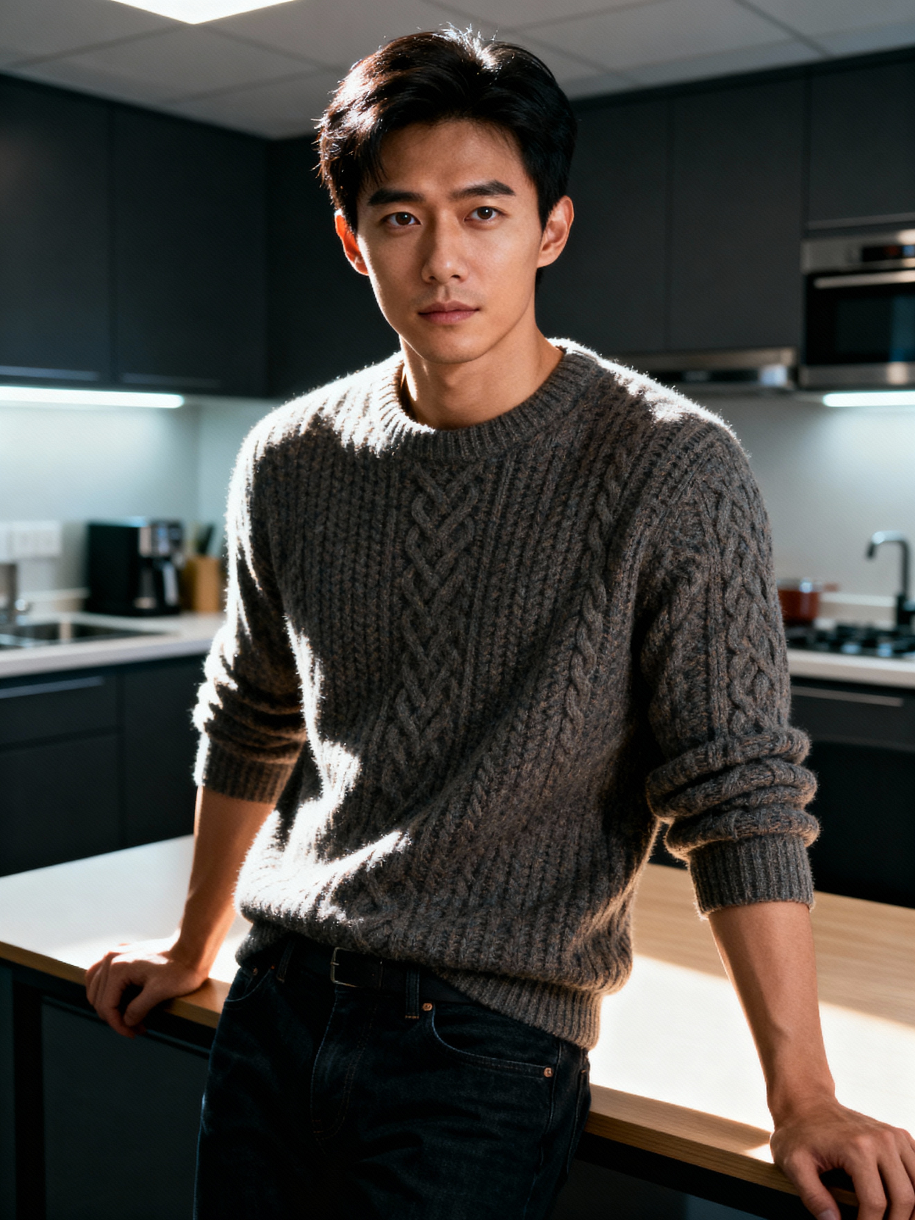 approachable model in quality knit sweater with dark jeans leaning against desk, modern office kitchen