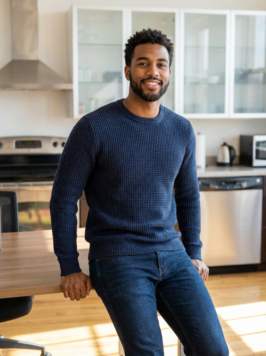 approachable model in quality knit sweater with dark jeans leaning against desk, modern office kitchen