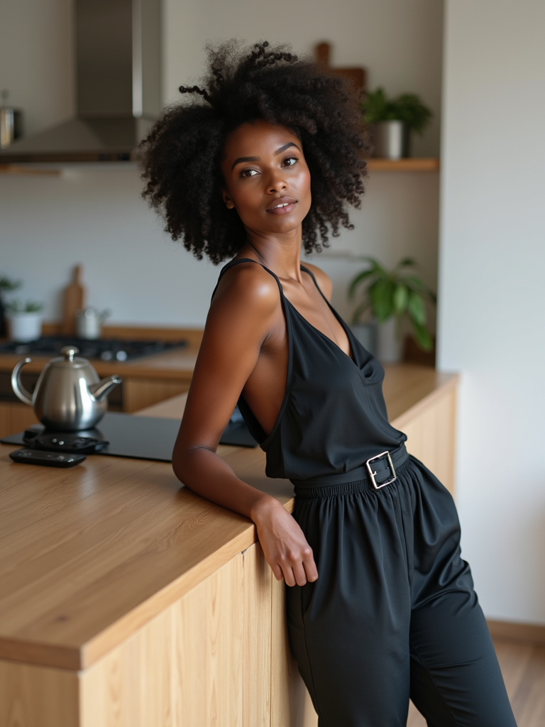 approachable model in smart casual dress or fashionable separates leaning against desk, modern office kitchen