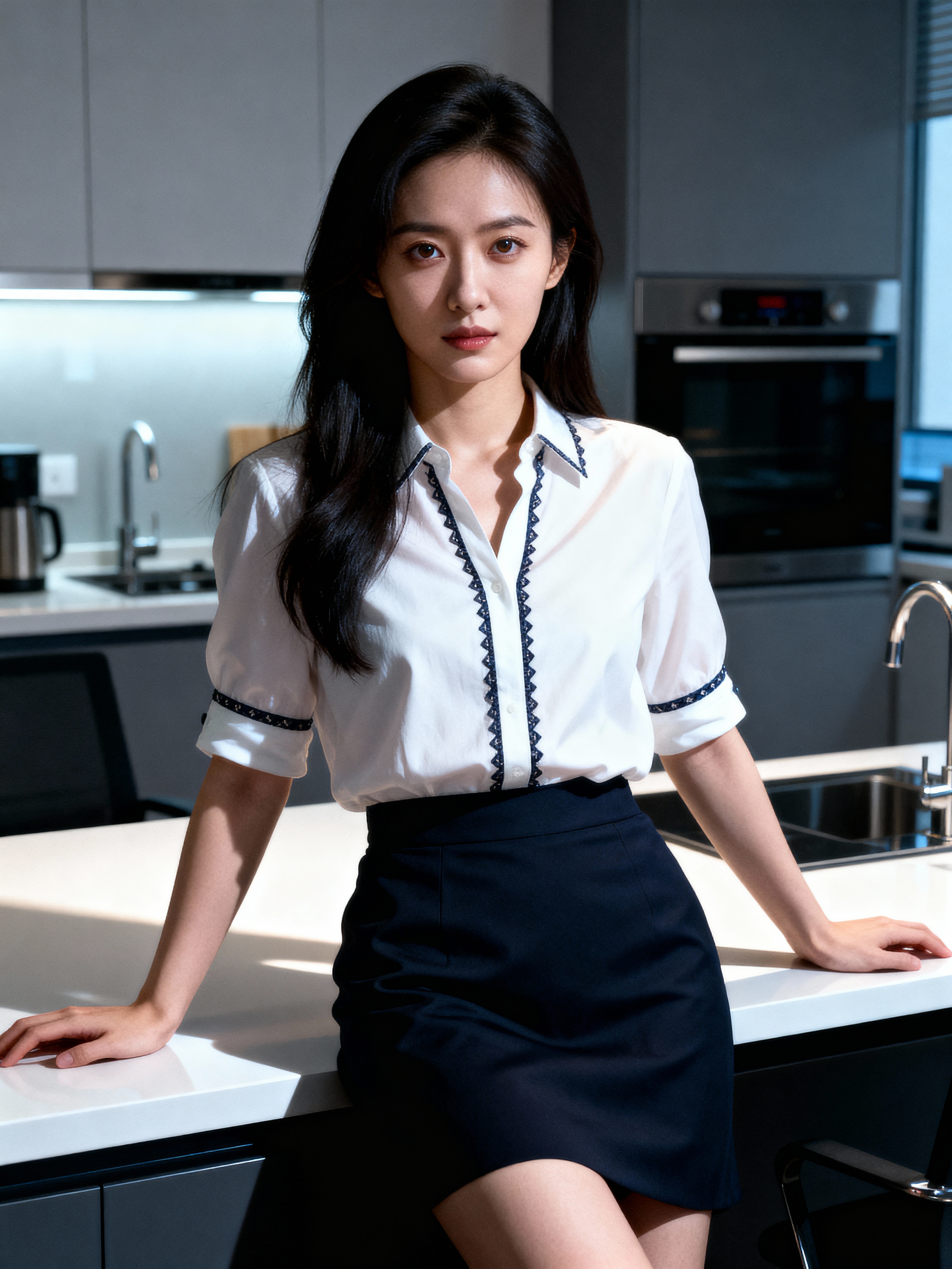 approachable model in smart casual dress or fashionable separates leaning against desk, modern office kitchen