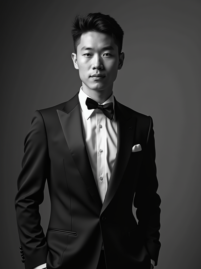 Artistic black and white wedding portrait, capturing emotions of the special day. Model wearing a monochrome wedding tuxedo . Timeless and graceful composition.
