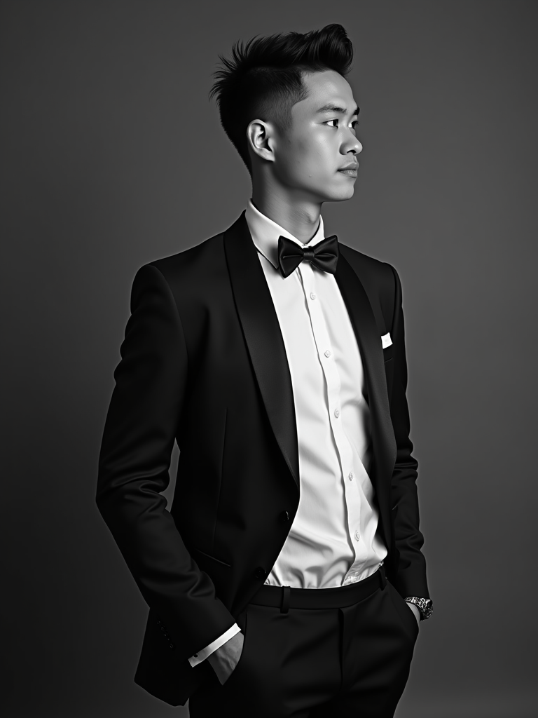 Artistic black and white wedding portrait, capturing emotions of the special day. Model wearing a monochrome wedding tuxedo . Timeless and graceful composition.