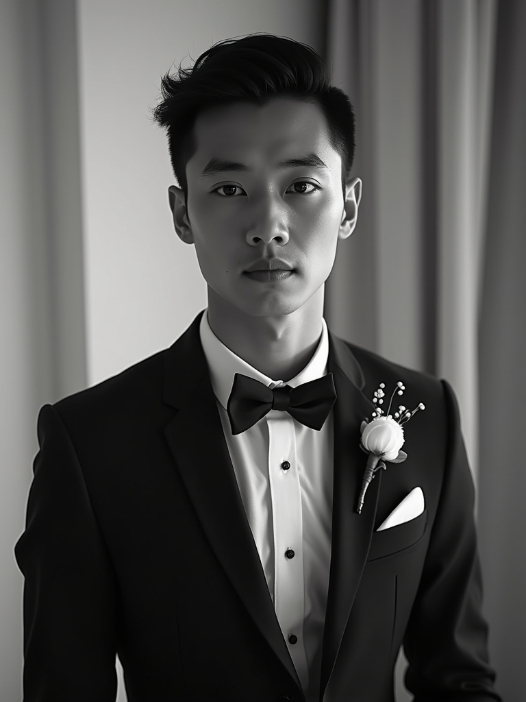 Artistic black and white wedding portrait, capturing emotions of the special day. Model wearing a monochrome wedding tuxedo . Timeless and graceful composition.