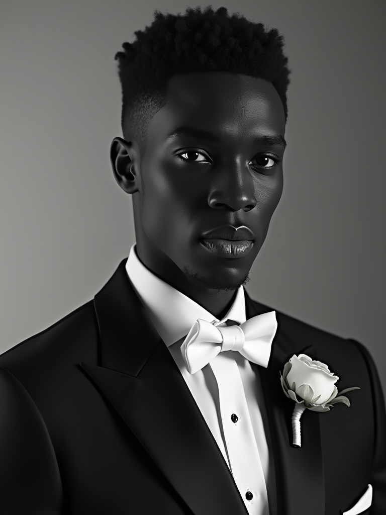 Artistic black and white wedding portrait, capturing emotions of the special day. Model wearing a monochrome wedding tuxedo . Timeless and graceful composition.