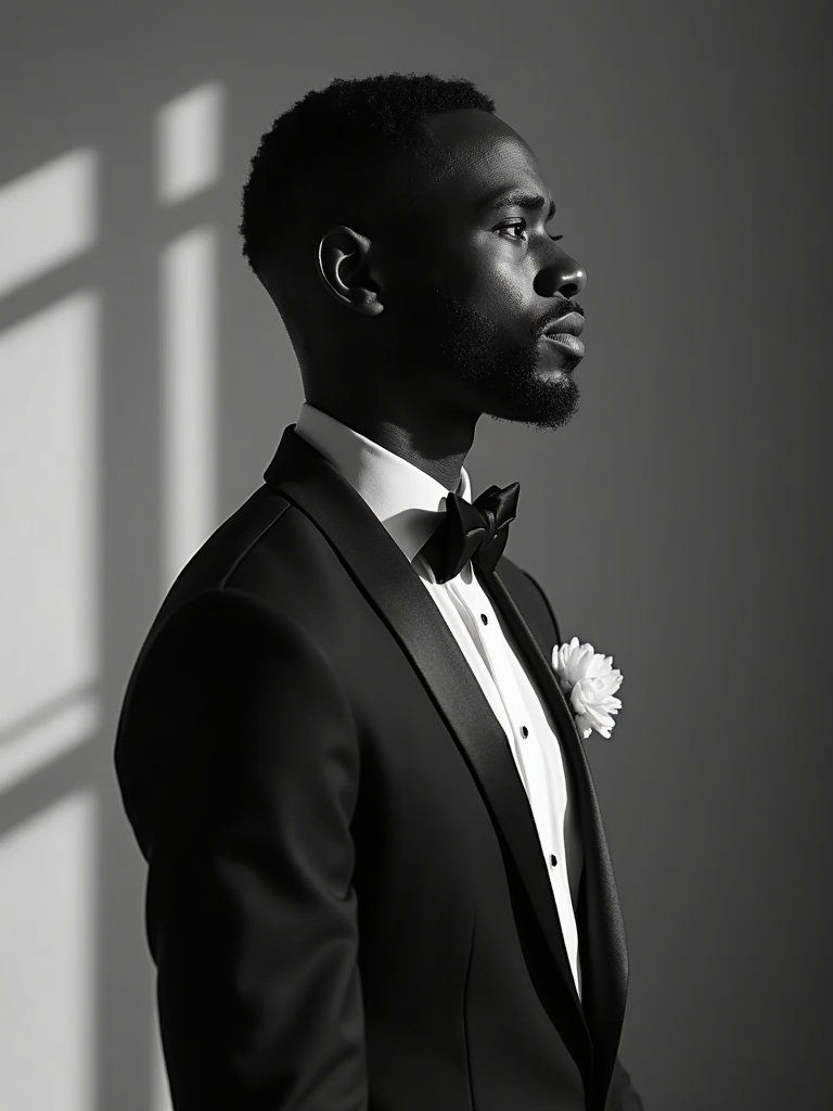 Artistic black and white wedding portrait, capturing emotions of the special day. Model wearing a monochrome wedding tuxedo . Timeless and graceful composition.