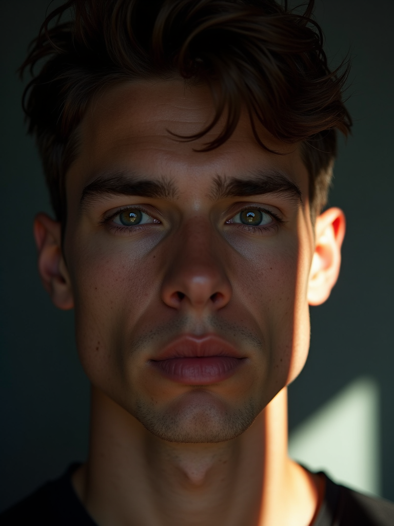 Artistic close-up of model with creative lighting. Dramatic shadows creating visual interest. Experimental photography style.