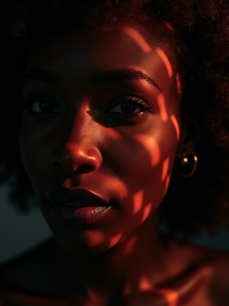 Artistic close-up of model with creative lighting. Unique lighting patterns across face, sensual expression . Experimental photography style.