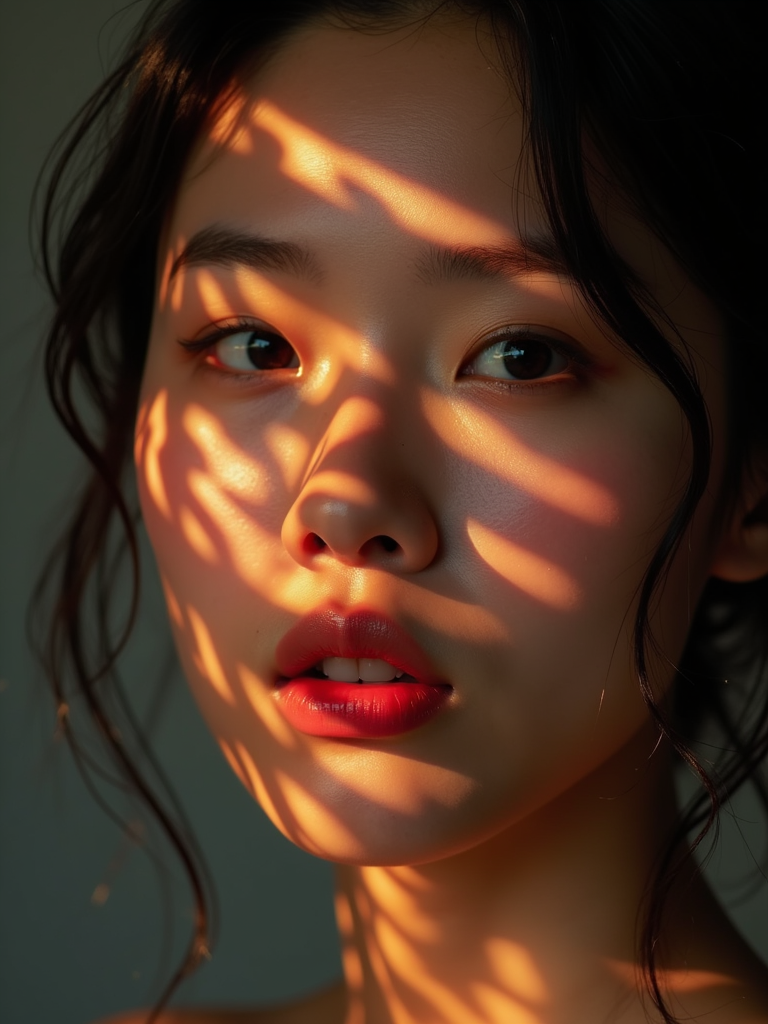 Artistic close-up of model with creative lighting. Unique lighting patterns across face, sensual expression . Experimental photography style.