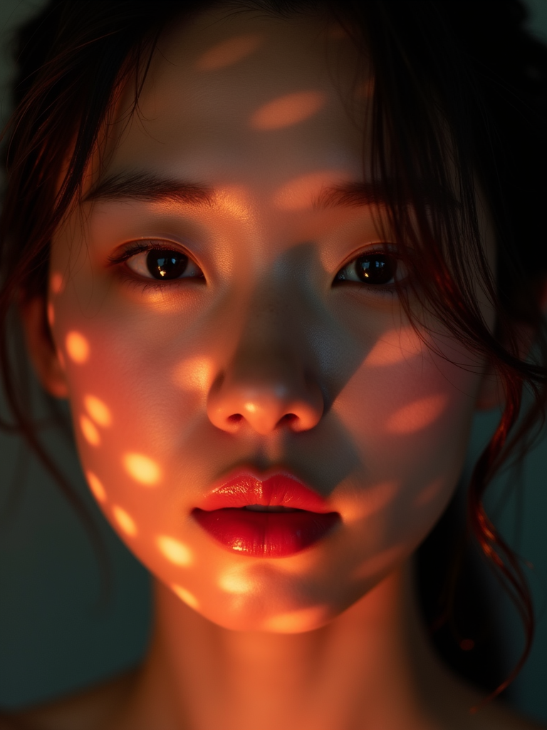 Artistic close-up of model with creative lighting. Unique lighting patterns across face, sensual expression . Experimental photography style.