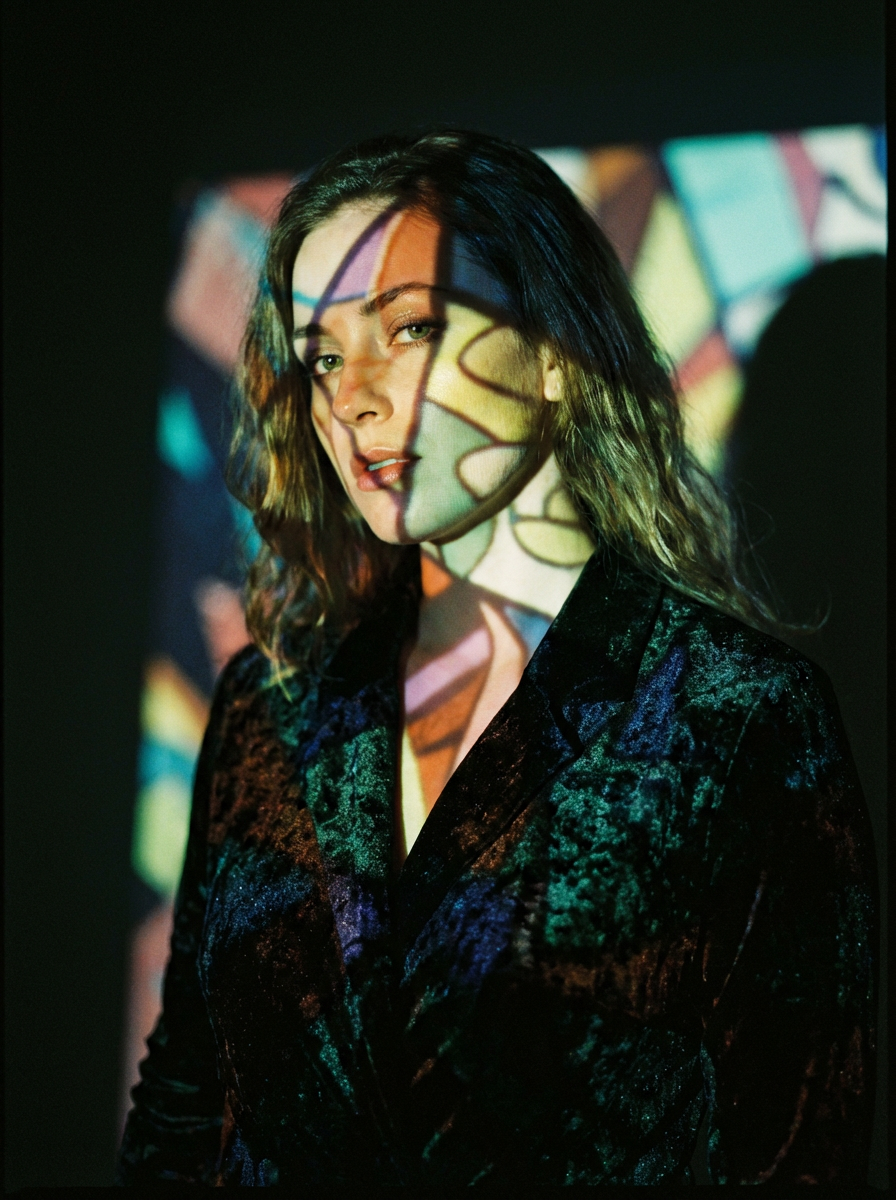 Artistic close-up of model with creative lighting. Unique lighting patterns across face, sensual expression . Experimental photography style.