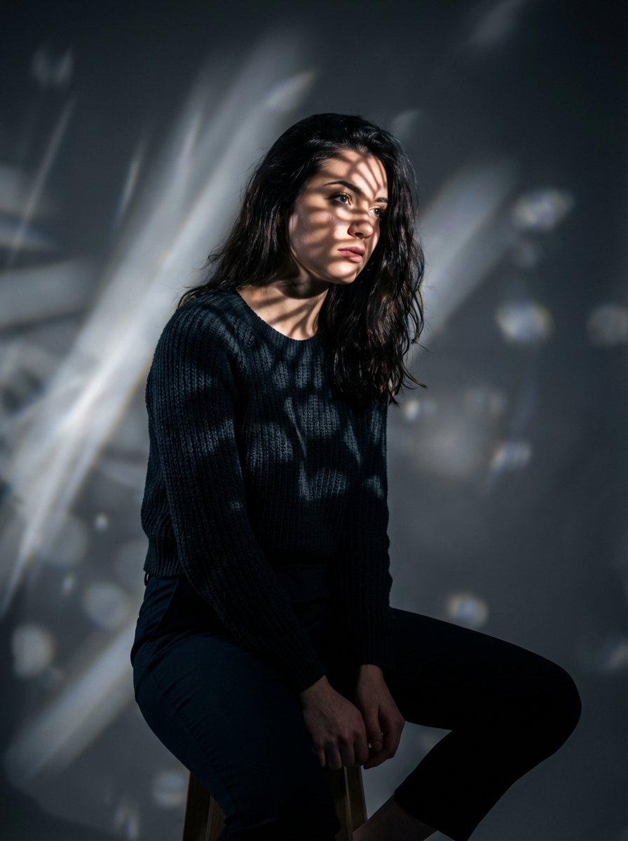 Artistic close-up of model with creative lighting. Unique lighting patterns across face, sensual expression . Experimental photography style.