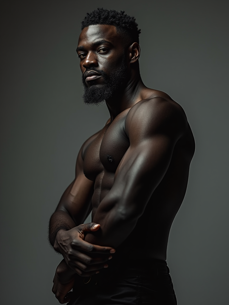 Artistic fashion portrait of model. Fashion-forward look, intense stance. Creative composition, professional lighting.