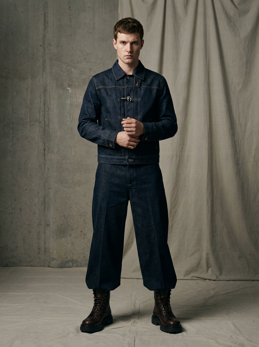 Artistic fashion portrait of model. Fashion-forward look, intense stance. Creative composition, professional lighting.