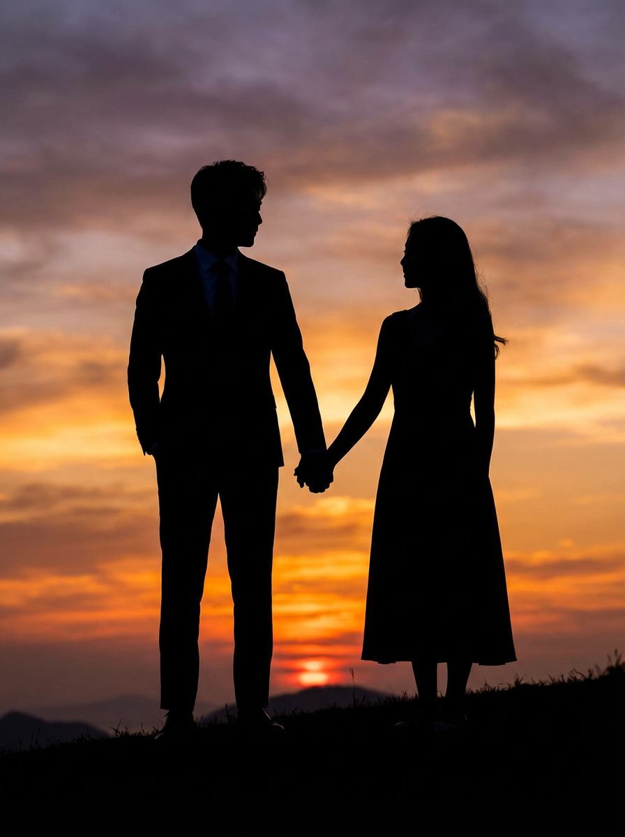 Artistic silhouette engagement portrait. Model wearing a structured suit . Dark silhouettes against a stunning sunset background.