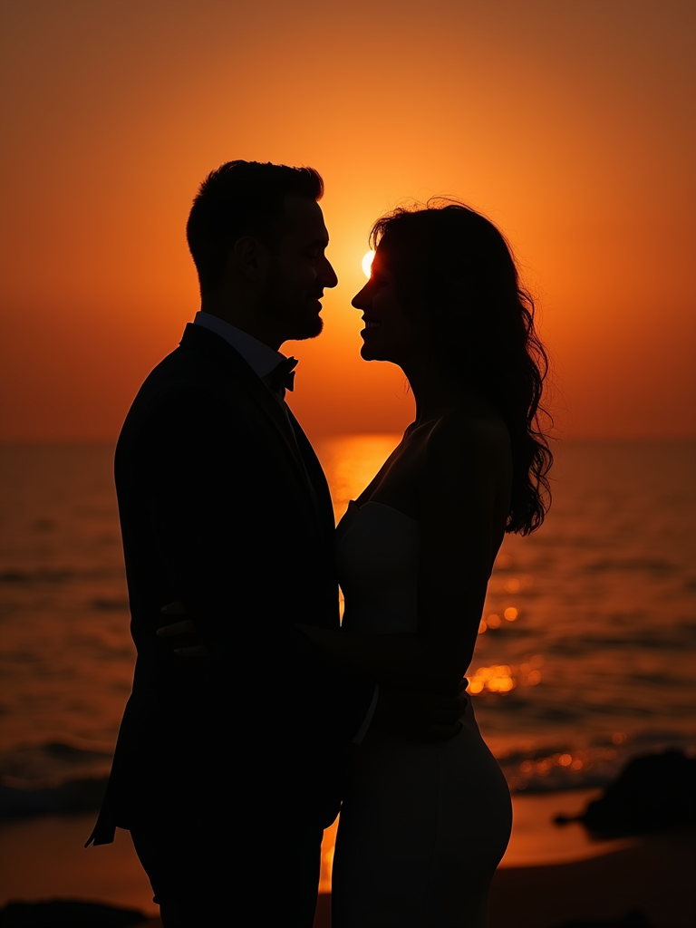 Artistic silhouette engagement portrait. Wearing a structured suit . Dark silhouettes against a stunning sunset background.