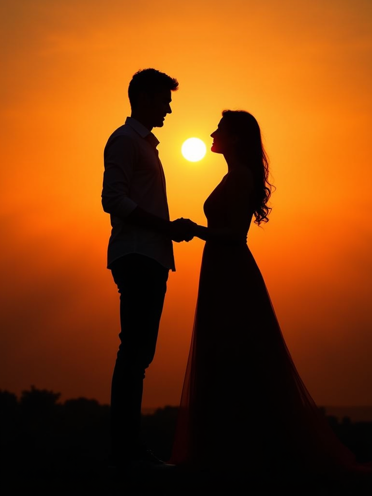 Artistic silhouette engagement portrait. Wearing a stylish long dress . Dark silhouettes against a stunning sunset background.