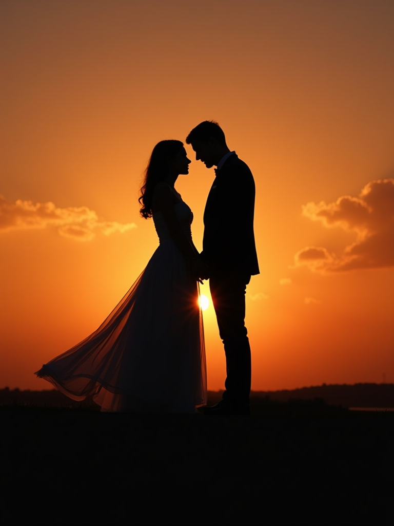 Artistic silhouette engagement portrait. Wearing a stylish long dress . Dark silhouettes against a stunning sunset background.