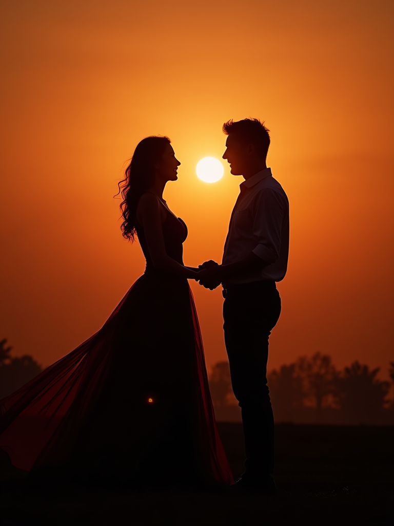 Artistic silhouette engagement portrait. Wearing a stylish long dress . Dark silhouettes against a stunning sunset background.