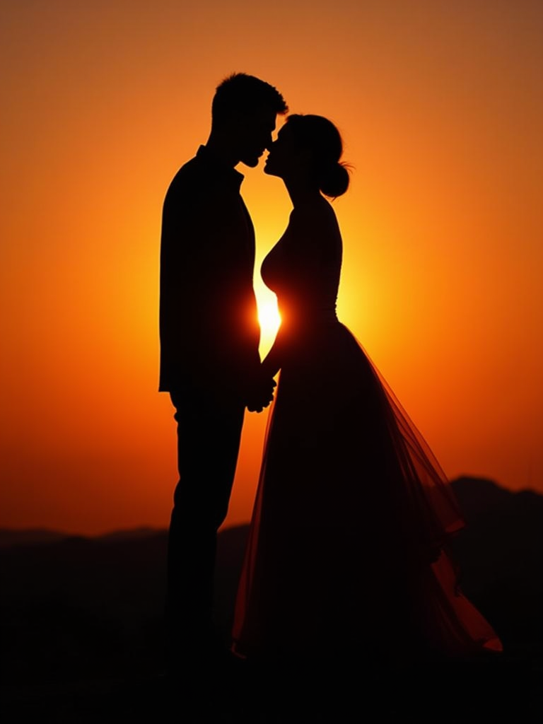Artistic silhouette engagement portrait. Wearing a stylish long dress . Dark silhouettes against a stunning sunset background.