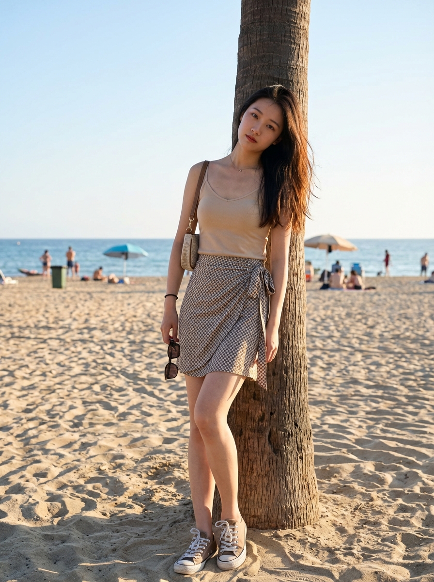 {"aspect_ratio": "4:5", "scene_type": "beach lifestyle fashion photography", "camera": {"device": "smartphone or mirrorless", "angle": "eye-level with slight tilt", "position": "standing a few feet in front of subject", "framing": "medium-full shot capturing head to knees", "orientation": "vertical", "focus": "sharp subject with softly detailed beach background", "lens_effect": "natural perspective with gentle background separation"}, "subject": {"gender": "model", "age": "adult", "face": {"features": "identical to reference image", "expression": "soft, calm, slightly introspective", "gaze": "looking directly toward camera", "head_position": "head slightly tilted, relaxed alignment"}, "hair": {"style": "long hair worn loose with natural flow", "placement": "falling over shoulders and back, lightly tucked behind one side"}, "posture": {"pose": "standing with body leaning against a palm tree", "lower_body": "one leg straight, the other bent at the knee with foot resting lightly on sand", "hips": "hips angled slightly to one side", "torso": "upright with a subtle lean toward the tree", "shoulders": "relaxed, slightly angled", "arms": "one arm bent holding a strap or accessory near shoulder, the other resting casually by side", "balance": "casual, effortless stance"}, "wardrobe": {"top": "lightweight sleeveless camisole with thin straps and soft gathered fabric", "bottom": "short patterned wrap skirt tied at the side", "footwear": "low-top casual sneakers", "accessories": ["small shoulder bag with thin strap", "delicate pendant necklace", "simple bracelet", "earrings ", "sunglasses held loosely in hand"]}}, "environment": {"location": "sandy beach setting", "foreground": {"element": "textured palm tree trunk beside subject"}, "background": {"beach_activity": "people seated on beach chairs and towels", "objects": "sun umbrellas scattered across sand", "horizon": "calm sea with distant shoreline or hills", "sky": "clear blue sky"}, "ground": "light-colored sand with footprints"}, "lighting": {"type": "natural sunlight", "time_of_day": "late afternoon", "direction": "side and slightly backlit sunlight", "highlights": "soft highlights along hair edges, shoulders, and clothing", "shadows": "gentle shadows cast on sand and body contours"}, "artistic_style": {"genre": "casual beach lifestyle and fashion photography", "aesthetic": "natural, youthful, relaxed", "mood": "carefree, summery, serene", "palette": ["soft neutrals", "sandy beige", "ocean blue", "warm sunlight tones"]}, "quality_tags": ["photorealistic", "natural pose", "candid beach moment", "clean composition", "no text", "no watermark"]}