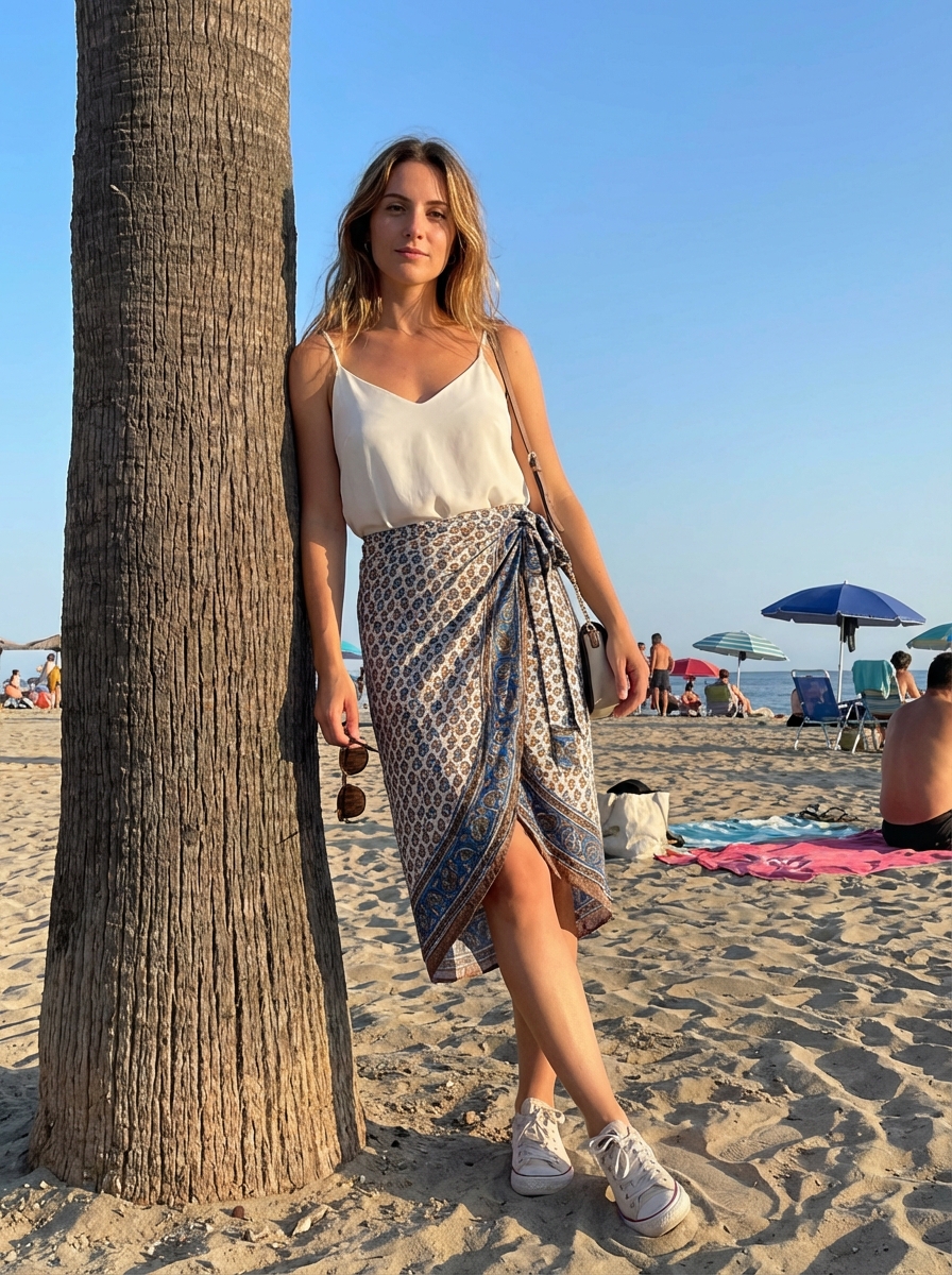 {"aspect_ratio": "4:5", "scene_type": "beach lifestyle fashion photography", "camera": {"device": "smartphone or mirrorless", "angle": "eye-level with slight tilt", "position": "standing a few feet in front of subject", "framing": "medium-full shot capturing head to knees", "orientation": "vertical", "focus": "sharp subject with softly detailed beach background", "lens_effect": "natural perspective with gentle background separation"}, "subject": {"gender": "model", "age": "adult", "face": {"features": "identical to reference image", "expression": "soft, calm, slightly introspective", "gaze": "looking directly toward camera", "head_position": "head slightly tilted, relaxed alignment"}, "hair": {"style": "long hair worn loose with natural flow", "placement": "falling over shoulders and back, lightly tucked behind one side"}, "posture": {"pose": "standing with body leaning against a palm tree", "lower_body": "one leg straight, the other bent at the knee with foot resting lightly on sand", "hips": "hips angled slightly to one side", "torso": "upright with a subtle lean toward the tree", "shoulders": "relaxed, slightly angled", "arms": "one arm bent holding a strap or accessory near shoulder, the other resting casually by side", "balance": "casual, effortless stance"}, "wardrobe": {"top": "lightweight sleeveless camisole with thin straps and soft gathered fabric", "bottom": "short patterned wrap skirt tied at the side", "footwear": "low-top casual sneakers", "accessories": ["small shoulder bag with thin strap", "delicate pendant necklace", "simple bracelet", "earrings ", "sunglasses held loosely in hand"]}}, "environment": {"location": "sandy beach setting", "foreground": {"element": "textured palm tree trunk beside subject"}, "background": {"beach_activity": "people seated on beach chairs and towels", "objects": "sun umbrellas scattered across sand", "horizon": "calm sea with distant shoreline or hills", "sky": "clear blue sky"}, "ground": "light-colored sand with footprints"}, "lighting": {"type": "natural sunlight", "time_of_day": "late afternoon", "direction": "side and slightly backlit sunlight", "highlights": "soft highlights along hair edges, shoulders, and clothing", "shadows": "gentle shadows cast on sand and body contours"}, "artistic_style": {"genre": "casual beach lifestyle and fashion photography", "aesthetic": "natural, youthful, relaxed", "mood": "carefree, summery, serene", "palette": ["soft neutrals", "sandy beige", "ocean blue", "warm sunlight tones"]}, "quality_tags": ["photorealistic", "natural pose", "candid beach moment", "clean composition", "no text", "no watermark"]}