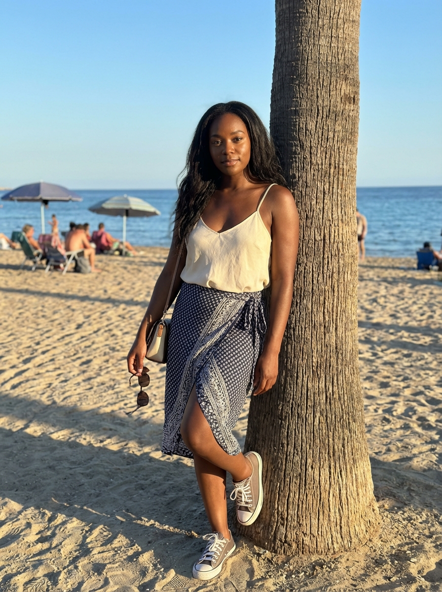 {"aspect_ratio": "4:5", "scene_type": "beach lifestyle fashion photography", "camera": {"device": "smartphone or mirrorless", "angle": "eye-level with slight tilt", "position": "standing a few feet in front of subject", "framing": "medium-full shot capturing head to knees", "orientation": "vertical", "focus": "sharp subject with softly detailed beach background", "lens_effect": "natural perspective with gentle background separation"}, "subject": {"gender": "model", "age": "adult", "face": {"features": "identical to reference image", "expression": "soft, calm, slightly introspective", "gaze": "looking directly toward camera", "head_position": "head slightly tilted, relaxed alignment"}, "hair": {"style": "long hair worn loose with natural flow", "placement": "falling over shoulders and back, lightly tucked behind one side"}, "posture": {"pose": "standing with body leaning against a palm tree", "lower_body": "one leg straight, the other bent at the knee with foot resting lightly on sand", "hips": "hips angled slightly to one side", "torso": "upright with a subtle lean toward the tree", "shoulders": "relaxed, slightly angled", "arms": "one arm bent holding a strap or accessory near shoulder, the other resting casually by side", "balance": "casual, effortless stance"}, "wardrobe": {"top": "lightweight sleeveless camisole with thin straps and soft gathered fabric", "bottom": "short patterned wrap skirt tied at the side", "footwear": "low-top casual sneakers", "accessories": ["small shoulder bag with thin strap", "delicate pendant necklace", "simple bracelet", "earrings ", "sunglasses held loosely in hand"]}}, "environment": {"location": "sandy beach setting", "foreground": {"element": "textured palm tree trunk beside subject"}, "background": {"beach_activity": "people seated on beach chairs and towels", "objects": "sun umbrellas scattered across sand", "horizon": "calm sea with distant shoreline or hills", "sky": "clear blue sky"}, "ground": "light-colored sand with footprints"}, "lighting": {"type": "natural sunlight", "time_of_day": "late afternoon", "direction": "side and slightly backlit sunlight", "highlights": "soft highlights along hair edges, shoulders, and clothing", "shadows": "gentle shadows cast on sand and body contours"}, "artistic_style": {"genre": "casual beach lifestyle and fashion photography", "aesthetic": "natural, youthful, relaxed", "mood": "carefree, summery, serene", "palette": ["soft neutrals", "sandy beige", "ocean blue", "warm sunlight tones"]}, "quality_tags": ["photorealistic", "natural pose", "candid beach moment", "clean composition", "no text", "no watermark"]}