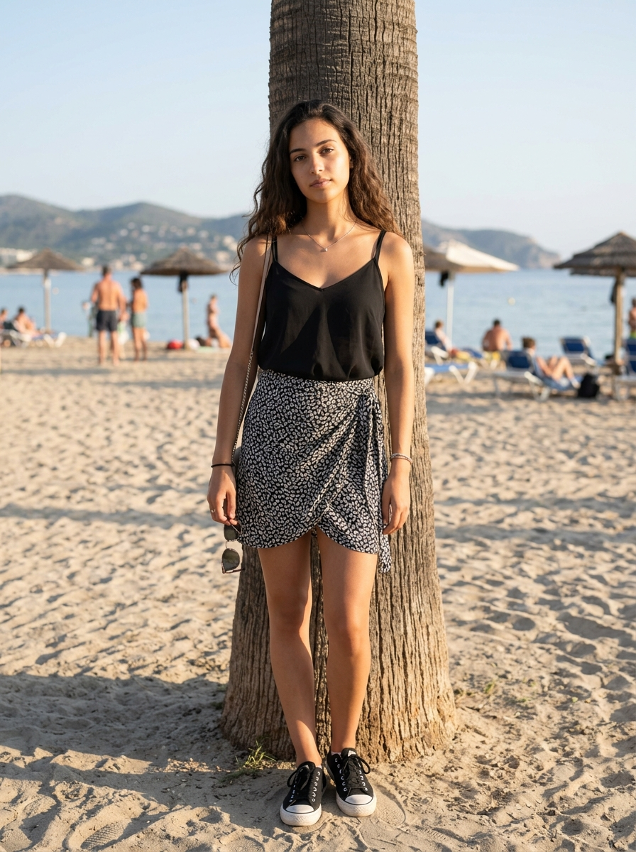 {"aspect_ratio":"4:5","scene_type":"beach lifestyle fashion photography","camera":{"device":"smartphone or mirrorless","angle":"eye-level with slight tilt","position":"standing a few feet in front of subject","framing":"medium-full shot capturing head to knees","orientation":"vertical","focus":"sharp subject with softly detailed beach background","lens_effect":"natural perspective with gentle background separation"},"subject":{"gender":"model","age":"adult","face":{"features":"identical to reference image","expression":"soft, calm, slightly introspective","gaze":"looking directly toward camera","head_position":"head slightly tilted, relaxed alignment"},"hair":{"style":"long hair worn loose with natural flow","placement":"falling over shoulders and back, lightly tucked behind one side"},"posture":{"pose":"standing with body leaning against a palm tree","lower_body":"one leg straight, the other bent at the knee with foot resting lightly on sand","hips":"hips angled slightly to one side","torso":"upright with a subtle lean toward the tree","shoulders":"relaxed, slightly angled","arms":"one arm bent holding a strap or accessory near shoulder, the other resting casually by side","balance":"casual, effortless stance"},"wardrobe":{"top":"lightweight sleeveless camisole with thin straps and soft gathered fabric","bottom":"short patterned wrap skirt tied at the side","footwear":"low-top casual sneakers","accessories":["small shoulder bag with thin strap","delicate pendant necklace","simple bracelet","earrings ","sunglasses held loosely in hand"]}},"environment":{"location":"sandy beach setting","foreground":{"element":"textured palm tree trunk beside subject"},"background":{"beach_activity":"people seated on beach chairs and towels","objects":"sun umbrellas scattered across sand","horizon":"calm sea with distant shoreline or hills","sky":"clear blue sky"},"ground":"light-colored sand with footprints"},"lighting":{"type":"natural sunlight","time_of_day":"late afternoon","direction":"side and slightly backlit sunlight","highlights":"soft highlights along hair edges, shoulders, and clothing","shadows":"gentle shadows cast on sand and body contours"},"artistic_style":{"genre":"casual beach lifestyle and fashion photography","aesthetic":"natural, youthful, relaxed","mood":"carefree, summery, serene","palette":["soft neutrals","sandy beige","ocean blue","warm sunlight tones"]},"quality_tags":["photorealistic","natural pose","candid beach moment","clean composition","no text","no watermark"]}