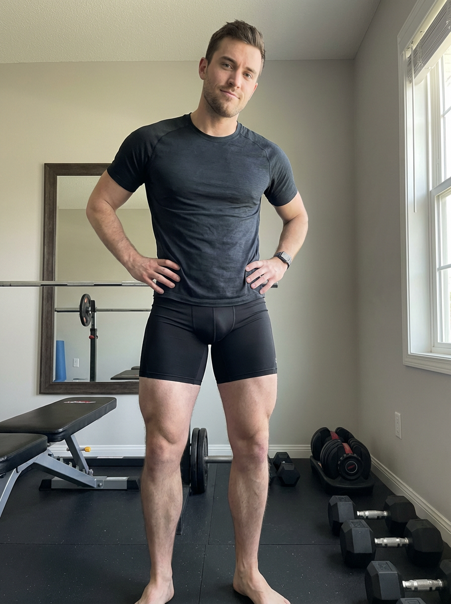 athletic model in compression shorts, defined legs and torso, confident stance, home gym setting