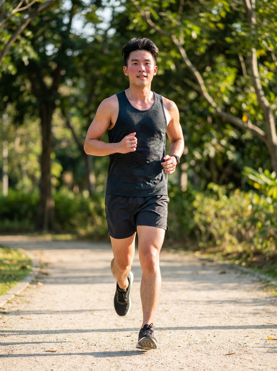 athletic model jogging outdoors, running shorts and tank top, healthy glow, park setting