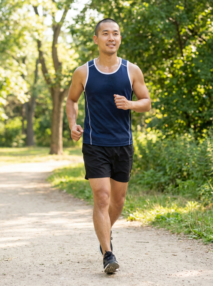 athletic model jogging outdoors, running shorts and tank top, healthy glow, park setting