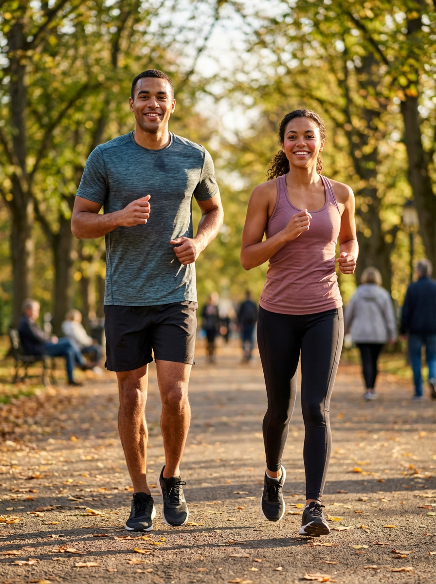 athletic model jogging outdoors, running shorts and tank top, healthy glow, park setting