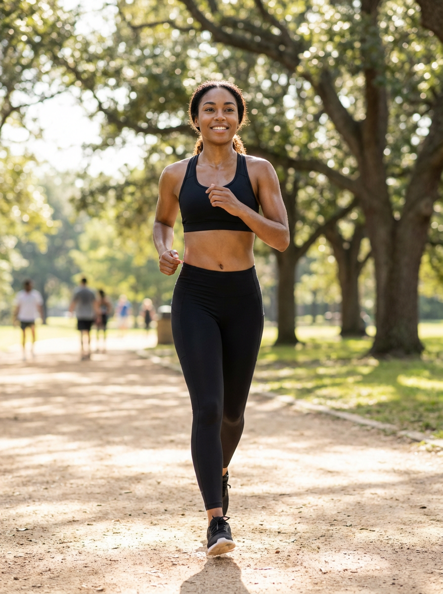 athletic model jogging outdoors, sports bra and leggings , healthy glow, park setting