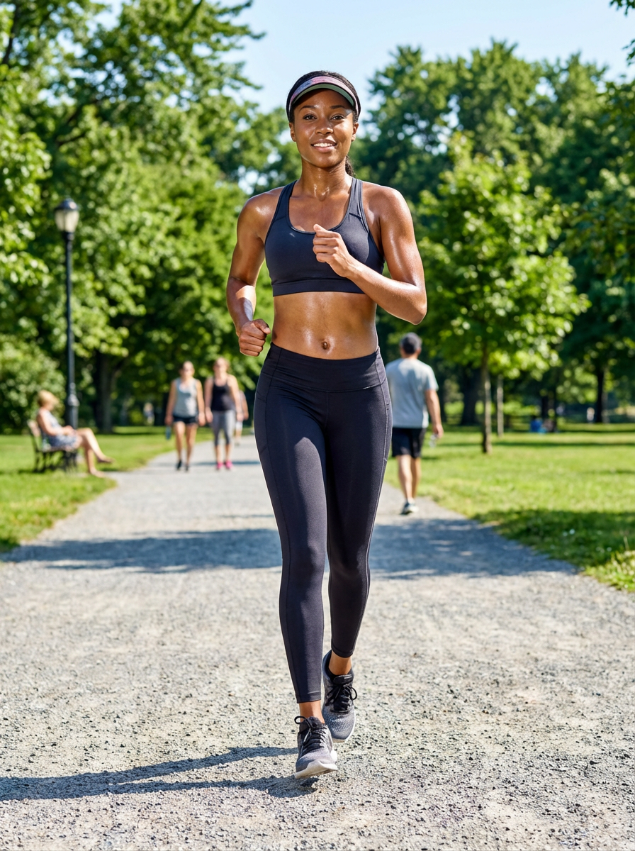 athletic model jogging outdoors, sports bra and leggings , healthy glow, park setting