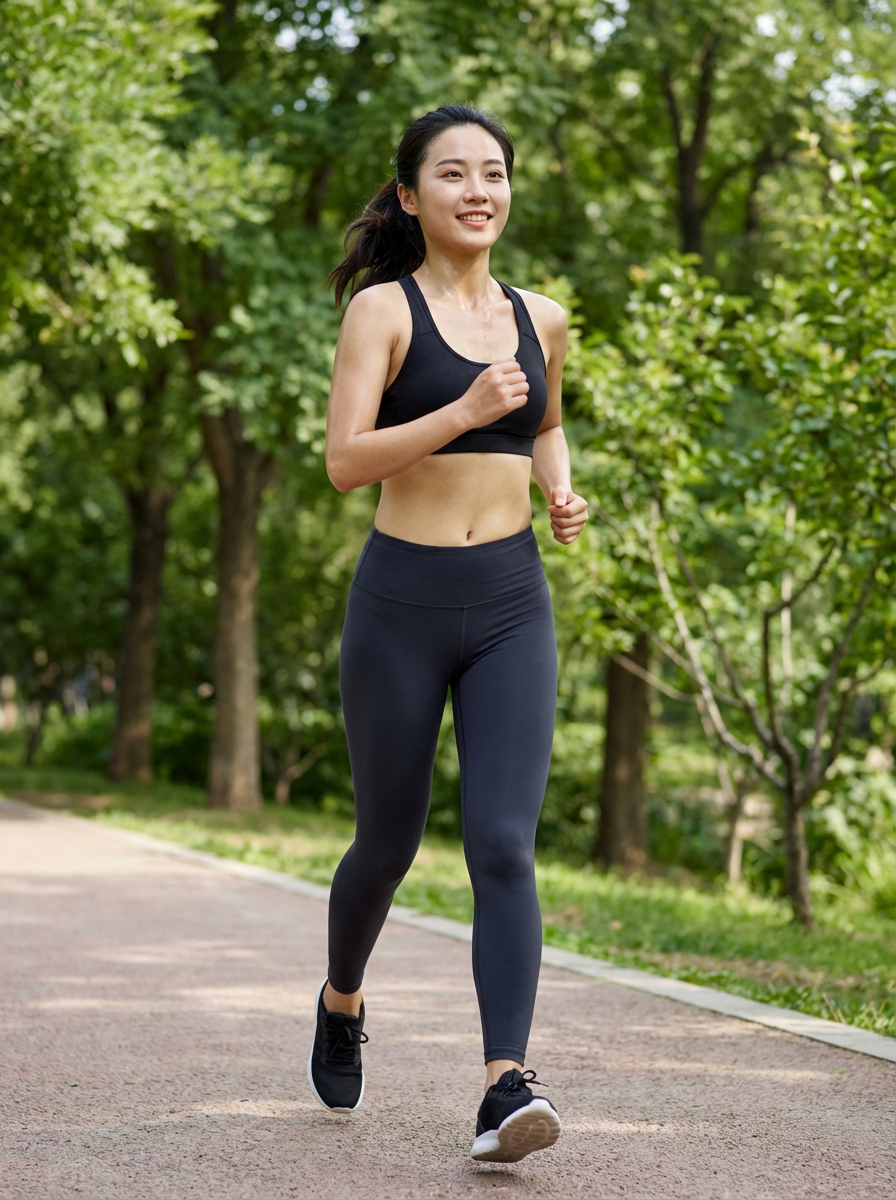 athletic model jogging outdoors, sports bra and leggings , healthy glow, park setting