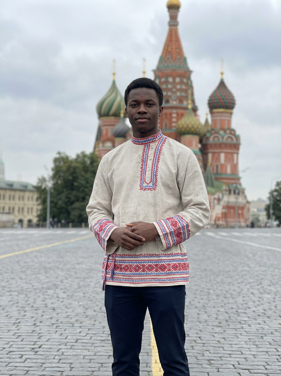 authentic and cultural model in Moscow wearing a traditional sarafan/kosovorotka, Saint Basil's Cathedral in the background