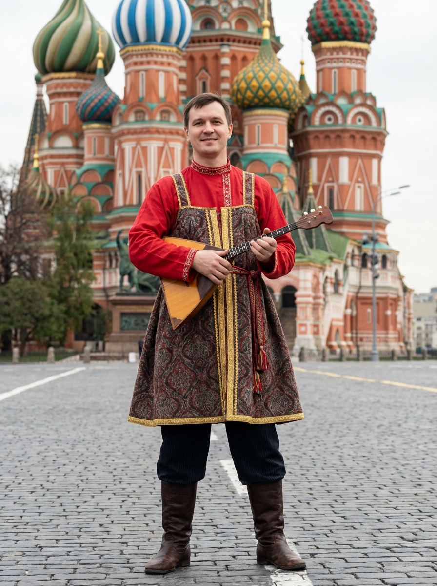 authentic and cultural model in Moscow wearing a traditional sarafan/kosovorotka, Saint Basil's Cathedral in the background