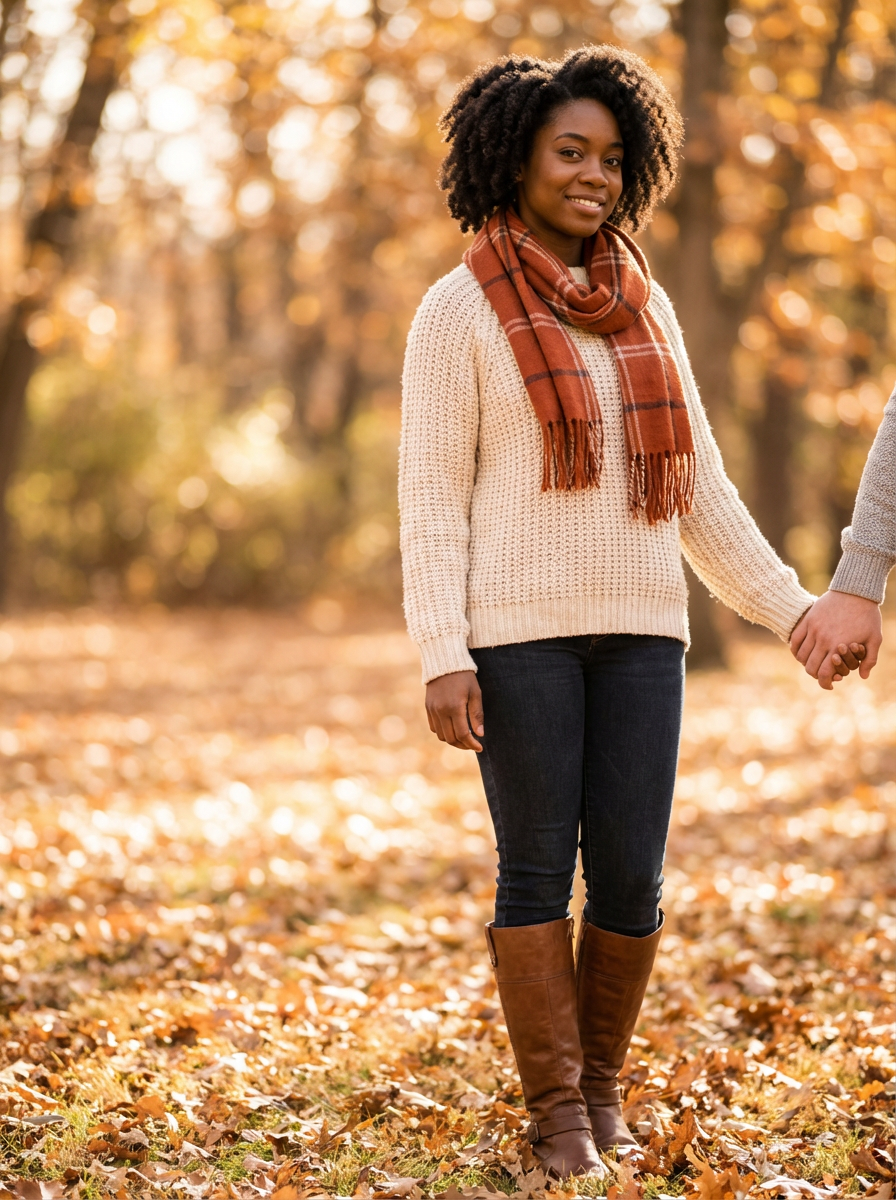 Autumn engagement photoshoot with cozy outfits. Model wearing a stylish knit sweater and scarf . Warm golden leaves in the background, soft bokeh effect.